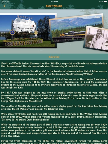 Welcome to the official City of Wasilla, Alaska mobile app. Our hope is to connect residents, visitors, businesses and government. In our app youll learn the history of the City of Wasilla, from the humble beginnings in 1917 to the present day. Plus keep up to date with city events and news. Youll find departments, resources, photos, maps with GPS and more.