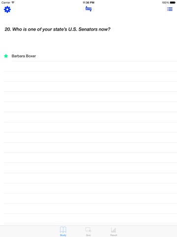 Save Time. There are 4 questions specific to the state (or US territory) in which you live: Name your Representative, Name one of your state Senators, Name your Governor and the capital of your state. You ONLY select you state (or US territory), these answers would be embedded directly into this mobile app. It means you don’t have to find the answer yourself, you may concentrate on this study.