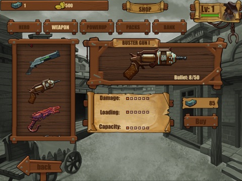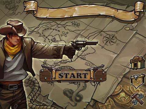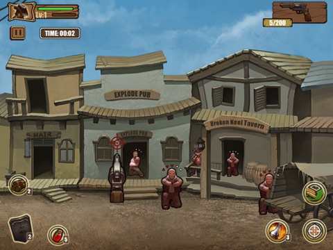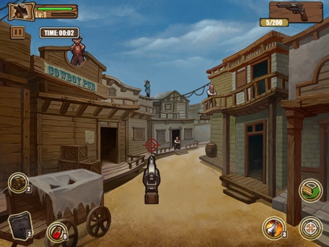 Cowboys and gunmen battle in American Western town. Drag with left fingertip to aim the gunman and tap with right fingertip to shoot.