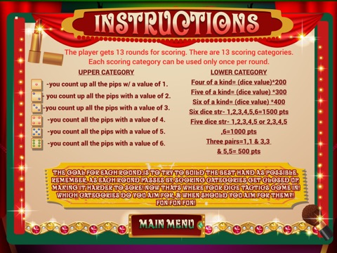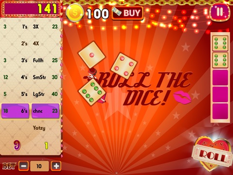 Yatzy is a dice game played with 5 dice. The objective is to roll all 13 dice combinations. You have only 3 rolls/chances to roll one of the 13 combinations. With this mobile Yatzy game, you wont even have to remember what the combinations are. Once you have a valid combination, the valid combinations will show up in boxes on the left side of the screen. You may roll more than 1 valid combinations each time, resulting in more than 1 box to show up. When this happens, pick the combination you would like to tick-off in that round. The skill is in picking the valid combination to tick off each time. After all, some combinations are easier to achieve than others! (Top tip: conserve the easy combinations for when you need them!)