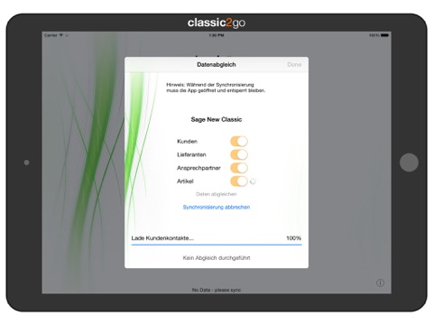 Die iPhone-App classic2go greift über einen kostenlosen Webservice („Listener“) direkt auf die Datenbank Ihrer Sage New Classic zu. Der „Listener“ übermittelt Kunden, Lieferanten, Artikel* und Ansprechpartner aus der Sage New Classic auf das iPhone / iPad. Den Abgleich starten Sie manuell – kurz darauf stehen Ihnen die Daten offline auf dem iPhone zur Verfügung.