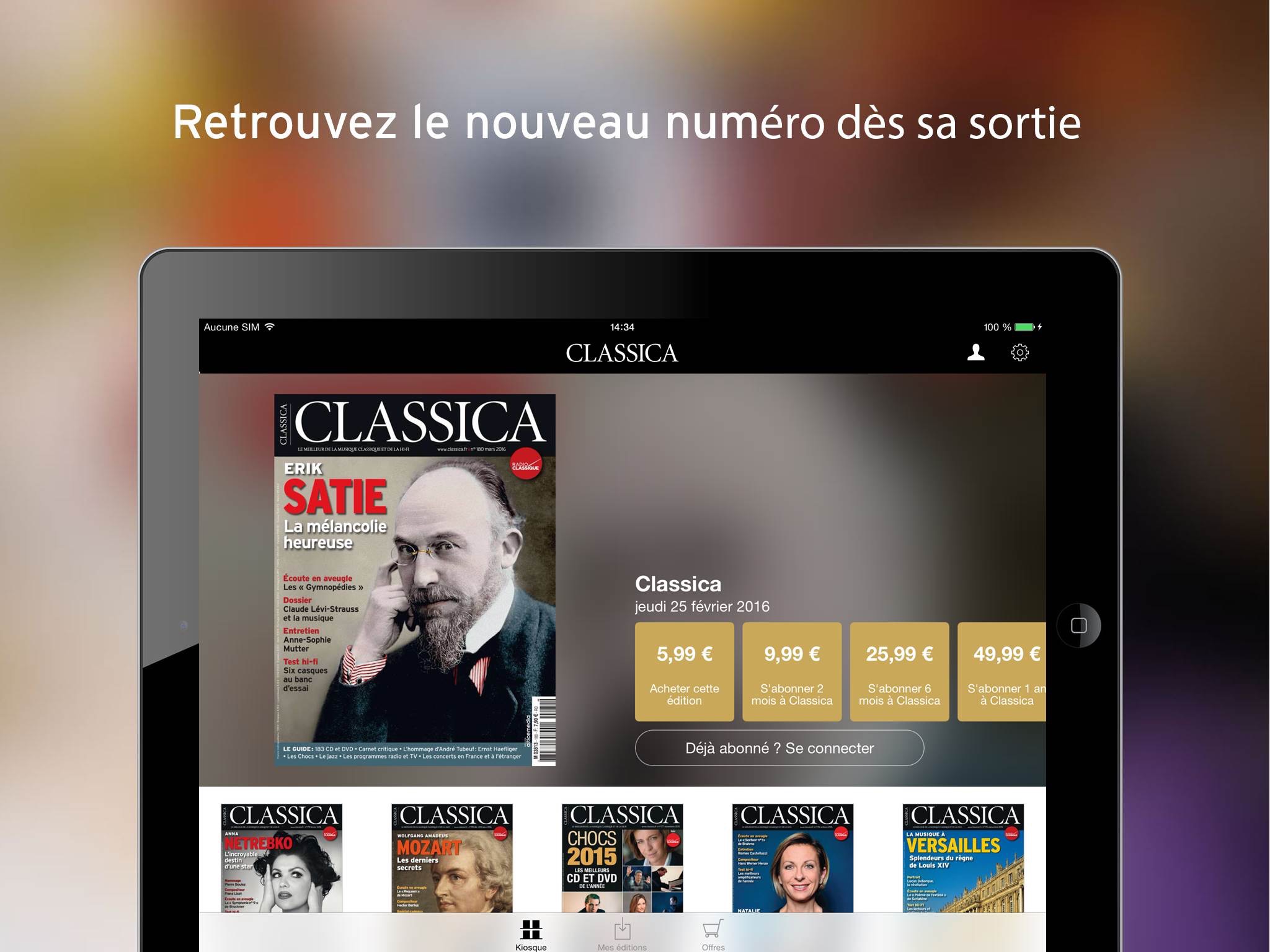 Telle quelle est actuellement cette appli nest pratiquement pas utilisable, une recherche des pages à partir du sommaire me paraît indispensable. Si lon doit feuilleter toutes les pages pour accéder aux dernières ce nest pas intéressant. Je suis abonné au mag papier depuis longtemps et jattendais cette appli pour le lire sur mon IPad.. ! Que dure très longtemps le magazine CLASSICA, indispensable pour tout mélomane !