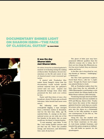 Classical Guitar is a quarterly magazine devoted to all aspects of music played on nylon-string guitars. Stories include profiles of prominent players, composers, and guitar-makers; articles about the rich history of the instrument, from Baroque times to the present; practical tips about playing and performing; reviews of classical-guitar concerts, CDs, and sheet music; relevant news and information about guitar festivals, competitions and societies; new guitars and other products; guitar reviews.