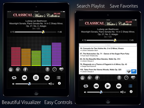 Enjoy the timeless works as you listen from Mendelssohns Wedding March, to Chopins Funeral March; from Strauss Blue Danube, to Beethovens Symphony No. 5; from Tchaikovskys Swan Lake, to Prokofievs Romeo and Juliet; as well as pieces like Moonlight Sonata, Ave Maria, Waltz Of The Flowers and Canon In D. Now fully compatible with the latest iOS. We hope youll love it!