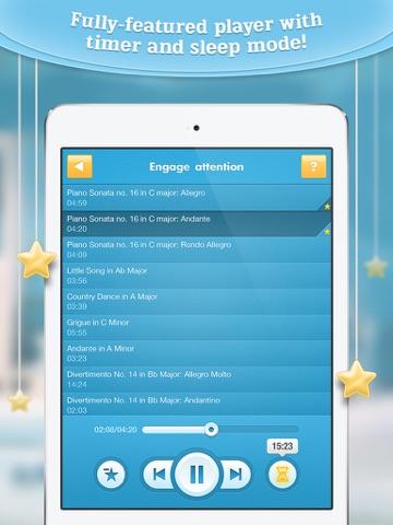 Classical Music for Kids includes 12 albums of Mozart compositions. Each album has specially selected music, to enhance learning, spatial intelligence, creativity and body awareness. The application is filled with special features, such as: background playing mode, package partition, easy controls, additional information on the albums and tracks etc.