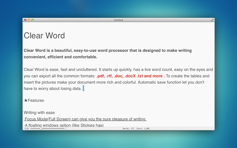 Clean Word is ease, fast and uncluttered. It starts up quickly, has a live word count, easy on the eyes and you can export all the common formats: .pdf, .rtf, .doc, .docx .txt and more . To create the tables and insert the pictures make your document more rich and colorful. Automatic save function let you dont have to worry about losing data.