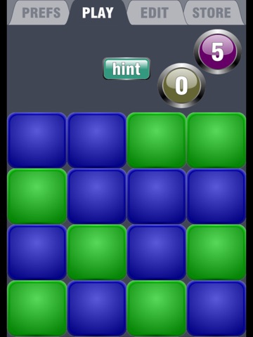 Under the tab ‘EDIT’ you can construct your own new challenge. In the selected grid it’s possible to change the color of every single tile. After editing you can play this puzzle by tapping the tab ‘PLAY’. You can play or compete with friends by editing the same puzzle and trying to find the absolute minimum number of turns.