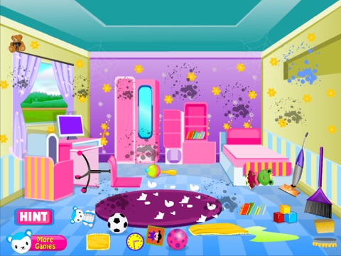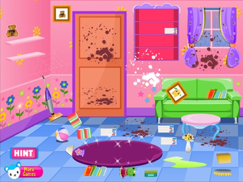In this game you have to clean a childs room, and you see how it can have fun doing it with this game clean. After you have finished cleaning will see that we have prepared some surprises related activities belelas baby. Are you ready to start? First you have to clean up her room because it is very big mess and she can not handle it alone because it is too small to do so. We need to place books in the right place, you need to lay down or to clean walls to make the bed she was arranging her little toys and remove the ceiling. Further our friend wants to play with you so you have to have the patience needed to satisfy her pleasures. She wants to eat but can not do because the hall is too dirty so I have to clean it and on it. You must place their books at the library to arrange her little bed and table, you put the pictures in the right places and not least the need to clean the dirty spots on the floor and give the sweep. Now our friend can eat quiet because the room is very clean. Please try other games for girls to see if you can handle this type of games.