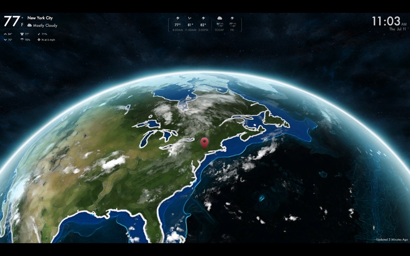 Not so much a "beautifully designed" or "spectacular" 3D globe as it is a smooshy watercolour effect, devoid of useful detail, wrapped around a sphere. Low resolution clouds on top of all that. Movement is at times jerky even on a new MacBook. Very little user preferences such as delay before globe rotates to next city, size of weather info or choice of what info to display. Id love to be able to remove the icon from my menubar. This has potential but Im hoping for a sharper, more detailed, and more robust version 2.