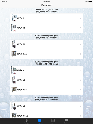- Go directly to entire equipment listing, sectioned by pool size. This shows not only the recommended equipment, but alternatives as well. From here, equipment details are available at the touch of an arrow, including dimensions, ozone output, photo, and a description.