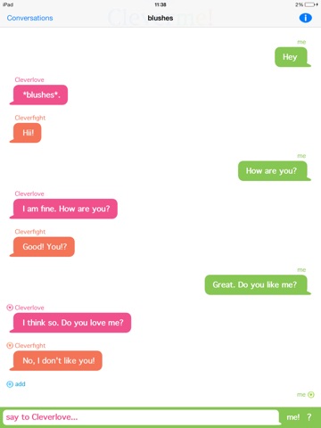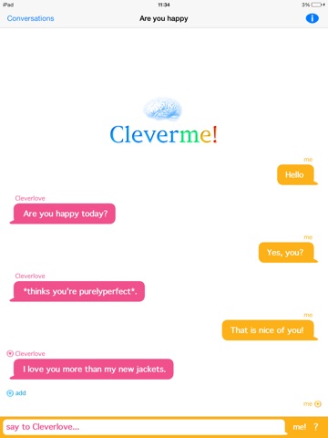 PLEASE NOTE: Cleverme! learns from you, and content you create is wholly your responsibility. You can talk to characters based on Cleverbot, which learns from the public and may say things that appear inappropriate. Use with discretion and at your own risk. The app is for entertainment only, not to be useful or to give advice, and parents must decide whether young people should have access.