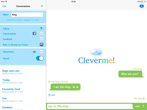 Version 1.0 of this app is just the beginning for Cleverme! Create yourself now, and soon youll be able to publish the virtual you, share yourself with friends, talk to them at any time of day or night, and find many more me! personalities to talk to. After a while your Cleverme! will talk for you, to thousands at once if it gets popular - at times of day and on a scale that the real you never could. Your social life, gone viral!