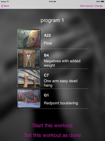 Based on available exercises the user can edit and save his/her personal program based on wanted characteristics. For instance create a training program aimed at increasing the fingers strength for a 7a, 7b climbing level.