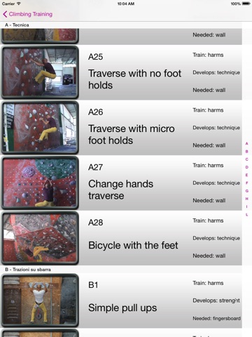 Exercises are subdivided into categories: Pull-ups,, dyno, board, etc. and, more in general, are subdivided into the following 4 macro categories: