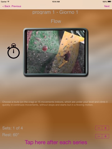 The application stores a list of possible exercises to be performed at the climbing wall, at the finger board or at the Pan Gullich. For each exercise a text description and a short video clip are presented in order to give you all information about the technique.