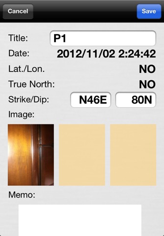 •Stored data(Strike,Dip,Latitude,longitude,Date,Photos (up to 3),Memo)