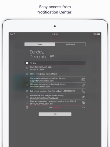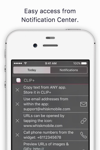 通知センターを引き出すだけでクリップされるため手軽で重宝してます。 たかがクリップボードなんて管理するのは煩わしく履歴的な使い方が出来れば良い人と思ってる人にオススメです。 欠点と言えば通知センターを出した時に表示領域がたまにウニョウニョするくらいです。