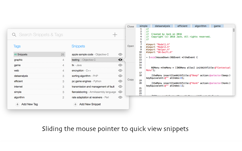 Some main features are easy to reach.Like searching,adding new snippet or adding for a tag,quick view of snippets(just by sliding the mouse arrow)
