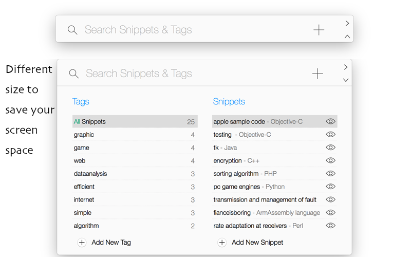 Clip offer a fast response user experience.You can search any tags and snippets with multiple keywords,Clip responds quickly.