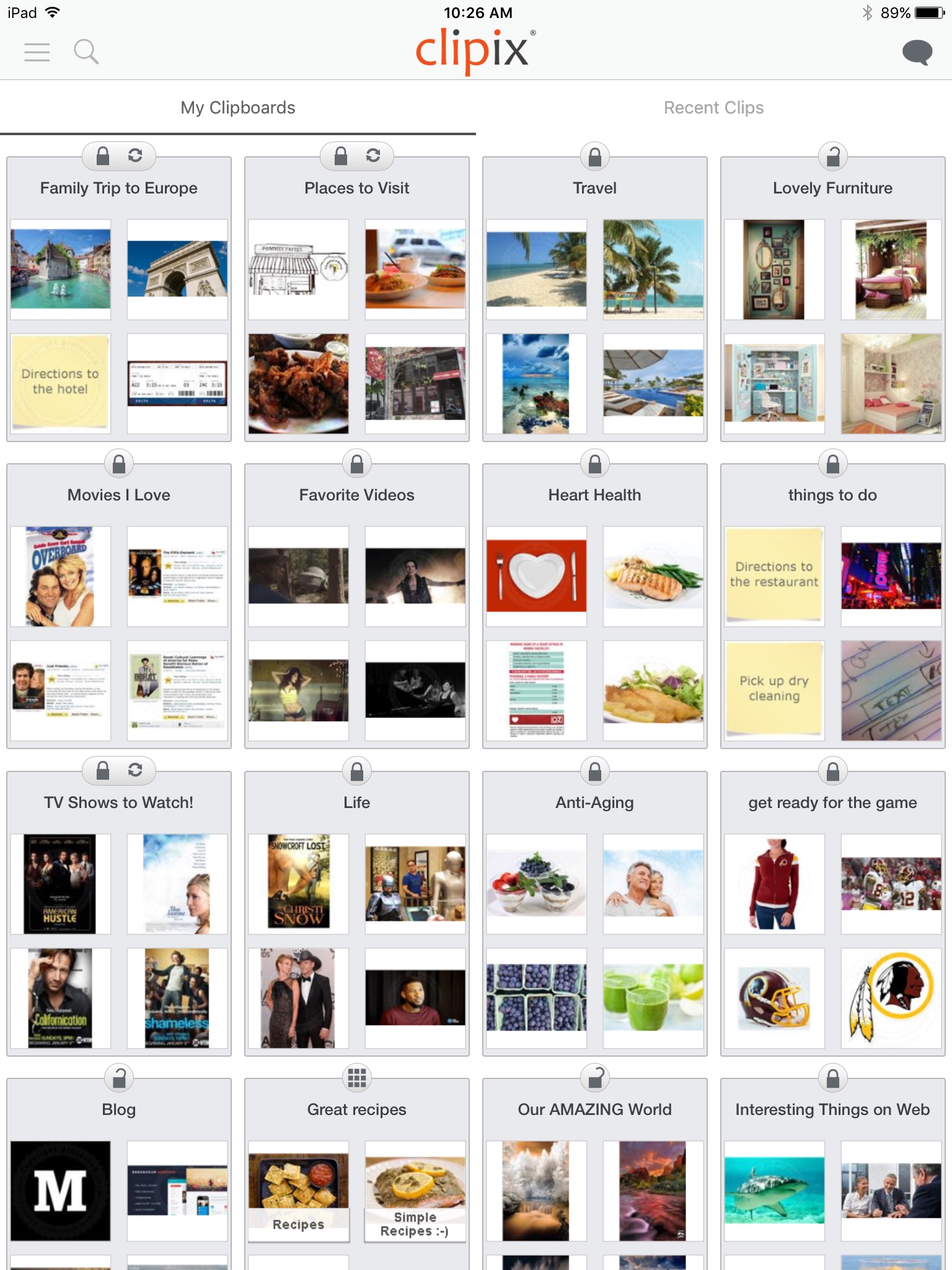 Clipix is an unbelievably useful tool that lets you save and organize everything you see online, and offline, into one central place. Everything you save is called a "clip". Clips are placed onto your personal clipboards for anything imaginable; articles you want to read, gift ideas, comparison shopping, home decorating–the possibilities are literally endless. It’s free, fun, and changing the way we organize our lives!