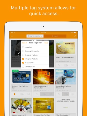 Quickly retrieve documents by using our intelligent tag system, gather information from your customers using forms (optional), update sales report, your team is not required to return to the office - its all available at your fingertips.