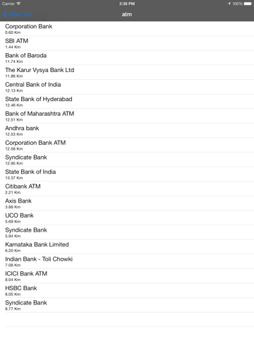 The user can select any place he/she would like to check. For instance, if the user selects the ATM option (of all the places provided as options) he can get all the list of ATMs and also their respective distances(in Km) to his current location where the nearest being the first in the list. If he/she selects a specific ATM, the map containing the ATMs location and the user’s current location are shown.
