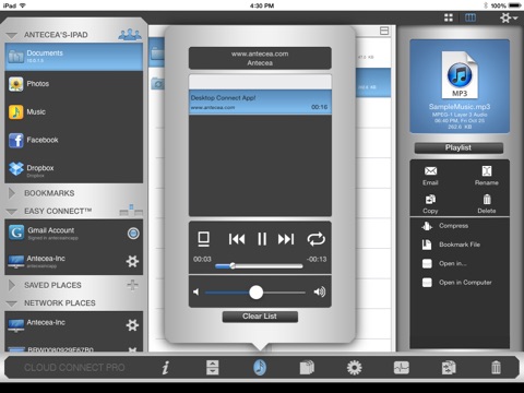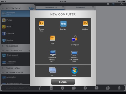 View and manage files on your Windows, Mac OSX (including Lion), Linux, or other network services like Dropbox, MobileMe iDisk, Google Docs, or Box.net directly from the iPad or iPhone.