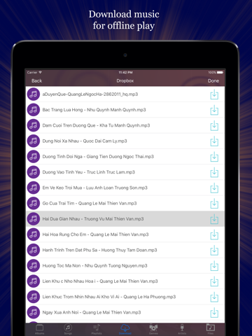 Save space on your device and have access to all of your music stored in GoogleDrive, DropBox, OneDrive.
