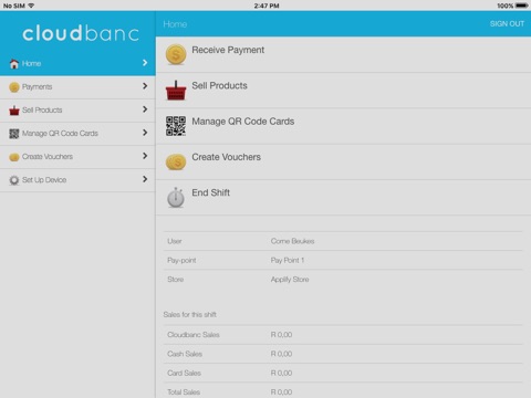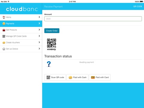 Cloudbancs point of sale app for merchants. You can sell products and receive payment from users that have a Cloudbanc account.