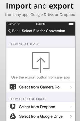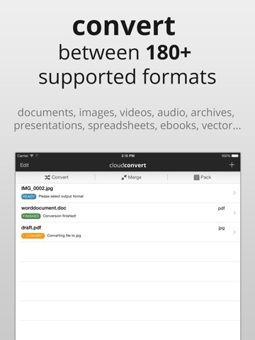 Please note that this app uses the online CloudConvert service (https://cloudconvert.com). This means that your files are uploaded to this service and afterwards downloaded on your device again. Therefore we recommend to not use our service with huge files on cellular. All files are transferred SSL encrypted and deleted immediately after the conversion is finished.