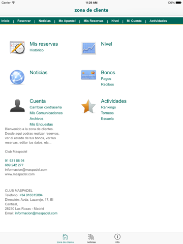 - Información del club, teléfono, mail, redes sociales, y acceso a mapa para llegar sin problemas.