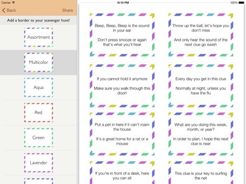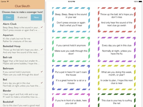 Your creative solution to entertaining is just a few taps away. Just choose the clues you want, select a fancy border, and Clue Sleuth will generate a scavenger hunt PDF that you can print to an AirPrint-compatible printer or send to your email! Just print, cut, and hide the clues.