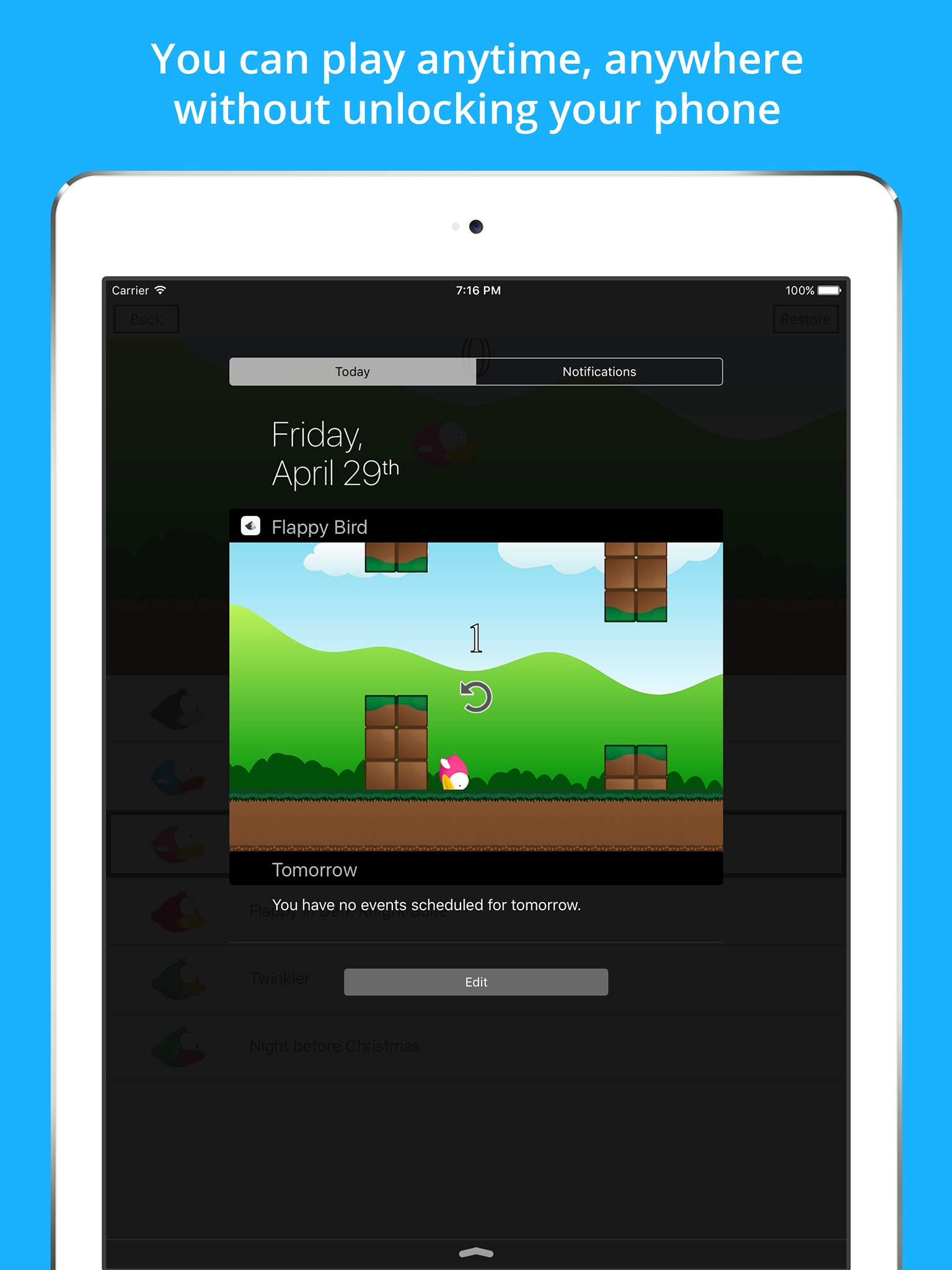 • Play with Clumsy anytime, anywhere, by just dragging down from the top on your screen to reveal the notification center and your Clumsy Bird will be there waiting for you!