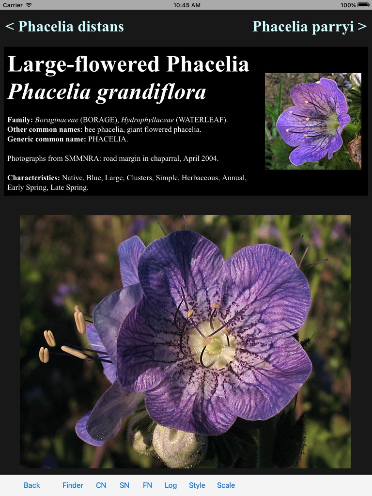 The App resides entirely on your iPhone, iPod Touch, or iPad, so the content generally loads much more quickly than even the highest connection speed can allow. However, the most significant benefit of the app is that if you are out in remote place without an Internet connection you can still access all of the App’s content. One consideration when downloading the App is that it takes up about 320MB (0.32GB) of the device’s internal storage due to the high number and resolution of the flower photographs.