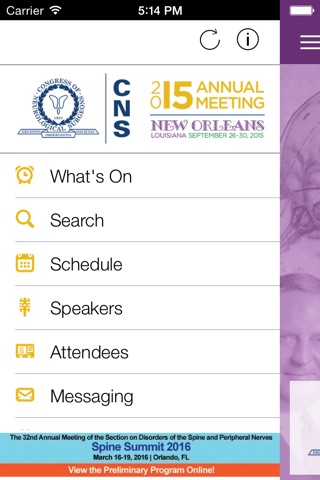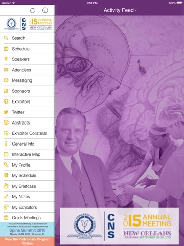 The Congress of Neurological Surgeons Annual Meeting Guide app puts the 2015 CNS Annual Meeting in the palm of your hand. Attendees can download the app and navigate the meeting using these convenient features: