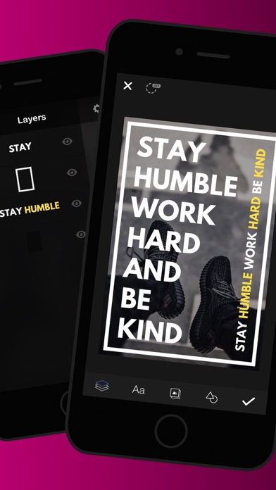 • Precision Editing: ALL layers ( text, shapes, images, canvas ) will snap to each other if within range. No more guessing if your text is perfectly aligned to the canvas or to another layer, CNVS does it for you!