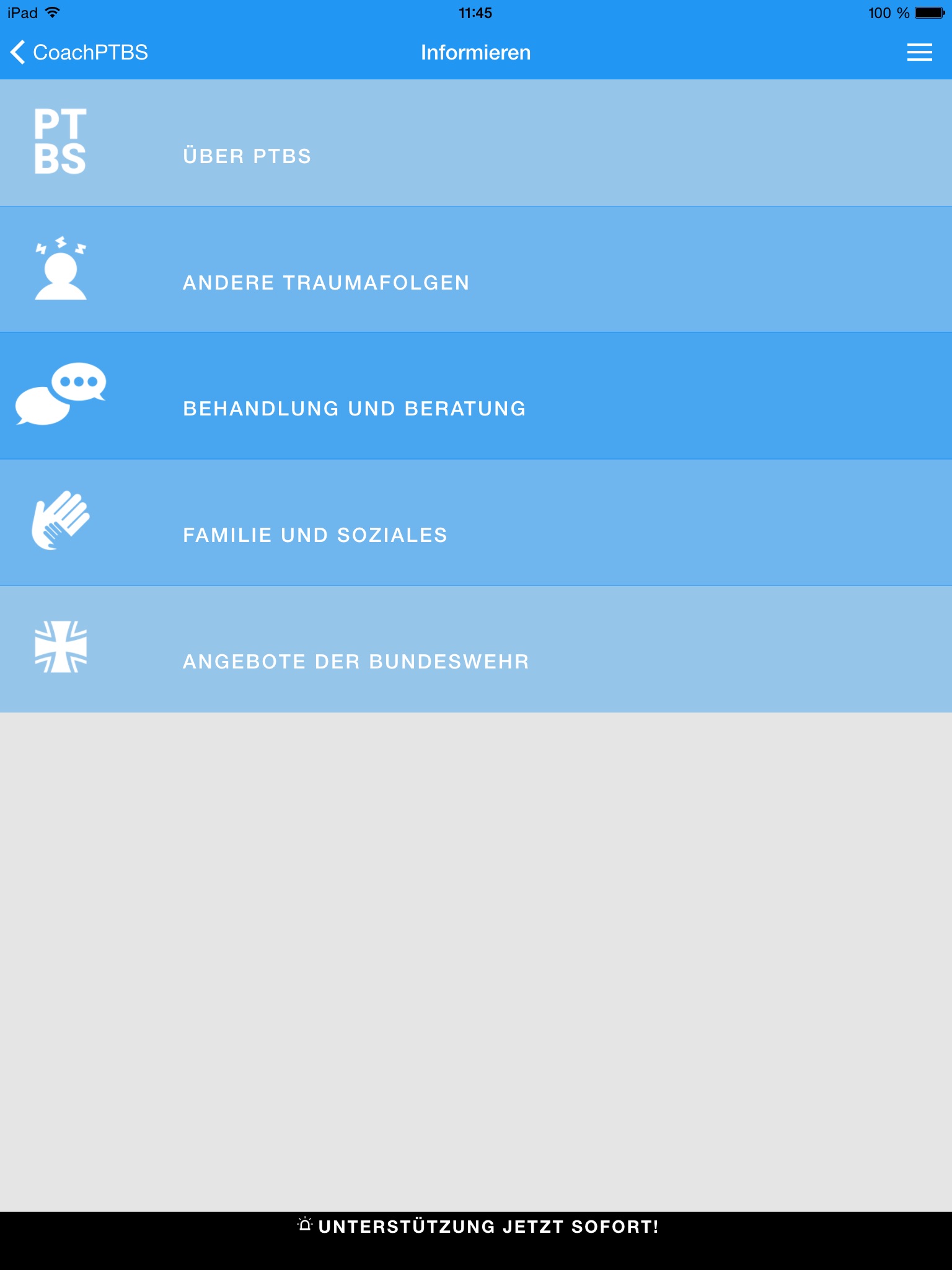 Mit dem CoachPTBS erhalten Sie als Betroffene oder deren Angehörige Informationen über das Krankheitsbild einer Posttraumatischen Belastungsstörung und anderer Einsatzfolgeerkrankungen. Es werden Kontakt- und Therapiemöglichkeiten aufgezeigt und erläutert sowie Ansprechpartner innerhalb und außerhalb der Bundesehr aufgelistet. Darüber hinaus bietet er Ihnen die Möglichkeit eine Selbsteinschätzung durchzuführen und enthält verschiedene Übungen zum Umgang mit Symptomen. Einige dieser Übungen können Sie persönlich mitgestalten. Aufgrund Ihrer Rückmeldungen werden Ihnen im Verlauf die bei Ihnen wirksameren Übungen vermehrt angeboten. Beachten Sie bitte, dass der CoachPTBS keine Psychotherapie ersetzt, sondern als niederschwelliges Ergänzungs- und Informationsangebot gedacht ist. Bei entsprechenden Symptomen wird empfohlen immer einen Truppen-/Hausarzt oder Facharzt für Psychiatrie aufzusuchen. Es werden keine persönlichen Daten vom Herausgeber gesammelt, genaueres zum Thema Datenschutz/Impressum können Sie auf der Seite link.ptzbw.org/datenschutz nachlesen. Wir weisen darauf hin, dass die Bundeswehr als der Herausgeber der App, keinen Einfluss auf die externen Nutzungs- und Datenschutzbestimmungen von den jeweiligen App Stores hat und außer der tatsächlichen Anzahl der Downloads dieser App, keine weiteren Informationen (also keine IP oder MAC Adressen) durch den Bereitsteller an den Herausgeber weitergegeben werden.