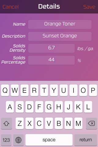 2. Create and store components of coating recipes by name, solids density, and solids percentage.