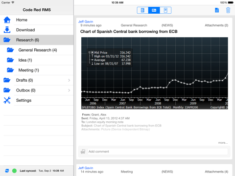 The Code Red RMS Good Dynamics Edition app allows you to create, edit, download and synchronize your research with the central Code Red RMS database all within the Good Dynamics secured container. Users can also add comments, search and download research by keyword(s), symbol, and/or date range.