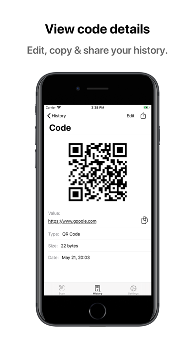 - View code details such as value, code symbology, date scanned and data size