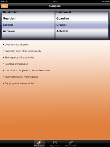 Mir erscheinen die "Tipps" schon sehr auf Bravo-Niveau (gibts die noch?) - nicht unbedingt tiefgründig oder gar differenziert. Mehr so in der Art von Horoskopen. Ich wollte erst schreiben: "Für Teenies bestimmt interessant", glaube aber, dass bei den meisten die Entwicklung und Erfahrung über das was diese App bietet doch schon deutlich hinaus geht. Wer meint dass es möglich ist, die vielfältigen menschlichen Eigenschaften, ihre Wechselwirkungen und alles was den Reiz von Kommunikation und Konfrontation ausmacht mit einem Schema F dieser Art abbilden zu können und dann noch behauptet, darin Hilfestellung zu geben … naja, lassen wir das. An die Entwickler: Kollega Rechtschreibung und seine Freunde beklagen sich über Misshandlung - das ist ja peinlich! Auch ist nicht alles übersetzt.