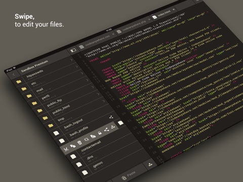 Codeanywhere is a text, code and markup editor, that has been redesigned and reengineered to be light, fast, and mobile-friendly. Connect to your FTP, SFTP Servers, Dropbox or Github account and easily manipulate your resources, folders or files just with the swipe of your finger.