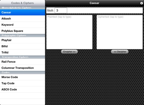 Note: This app is for educational and entertainment purposes. None of the encryption methods in this app are safe enough to use for actual secret messages.