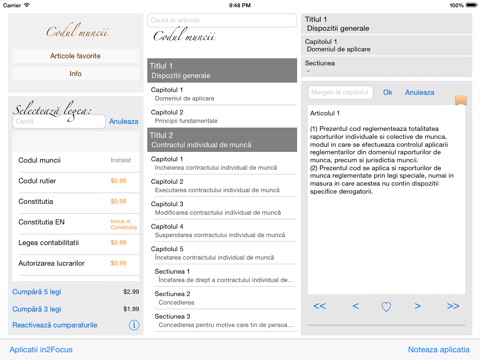 Aplicatia contine in Meniu si alte module care pot fi achizitionate (ex: Constitutia Romaniei, Codul Rutier, Legea contabilitatii, Autorizarea lucrarilor de constructii, Calitatea in constructii, Lege detectiv particular etc.).