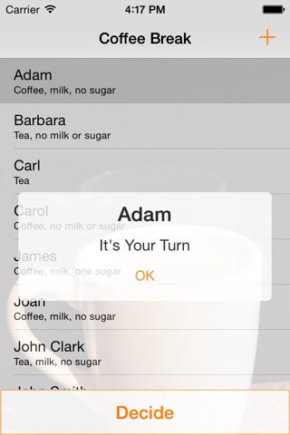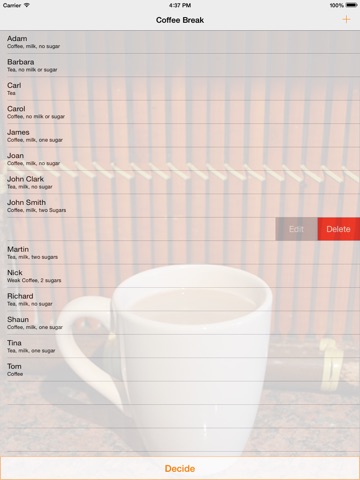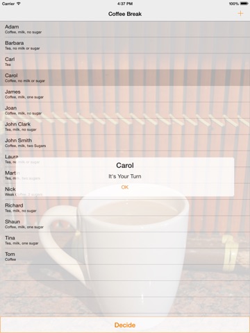Eradicate the need for office disputes with Coffee Break: Round Decider! Enter the names and preferences of your colleagues or friends then hit Decide. The app will decide whose turn it is to make the Coffees or Teas. All decisions are fair and no individual will be chosen twice until all others have had their respective turns.