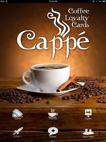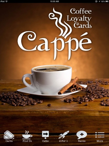 Cappe App provides you with mobile coffee cards from your favorite coffee shops. Instead of carrying around several loyalty cards, theyre all in your phone now. Enjoy cafe coupons and coffee loyalty cards for all your favorite java hangouts. You can also request a loyalty coffee card from your favorite shop, if your shop is not yet listed.