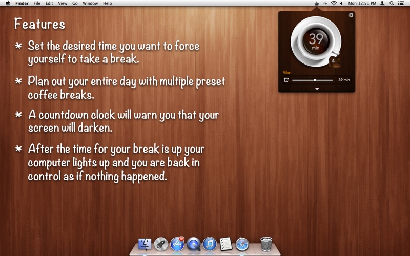 Schedule your day with CoffeeTime. Imagine your Mac telling you with bold actions that you have been sitting in front of the screen too long or that you need a break to take the dog for a walk. A mechanism that refuses to do anything else for you until you rest your eyes and grab some fresh air going for a walk.