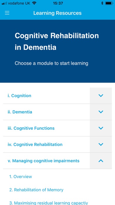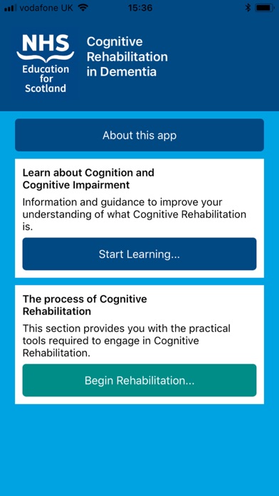 There are two sections in the application; the Learn section and the Rehab section. The Learn section provides educational information on cognition, cognitive impairment and the process of cognitive rehabilitation. The Rehab section is more interactive and practical in terms of guiding the user through the process of cognitive rehabilitation for a person in the early stages of dementia.