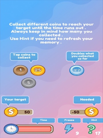 At the start of the level you are given a target score presented on the lower left side of the screen . Get to that amount by tapping various coins and by adding their value . You can use X2 coins to double what you collected so far . Always keep in mind what you collected .
