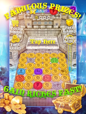 Storm the castle of magic royal riches with CoinMania Fortress - Enchanted Block Kingdom Dozer! Use the Coin Castle’s bulldozing stone drawbridge to push gold coins and bonus gems into your coin hopper! Do your best to collect Super Bonus Prize Enchanted Apples, Magic Mirrors and Enchanted Princess Tiara for even more cash!